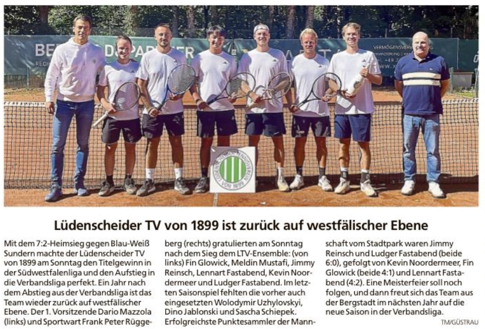 Mit insgesamt sieben Erwachsenen- und acht Jugendmannschaften ist der LTV 1899 sportlich sehr gut aufgestellt. Die 1. Herren spielen seit Jahren auf Verbandsniveau und auch die Jugendmannschaften – zuletzt die Junioren U12 mit dem Westfalenmeistertitel – behaupten sich erfolgreich im Verband. Den LTV 1899 finden Sie hier auf der offiziellen Webseite des WTV.